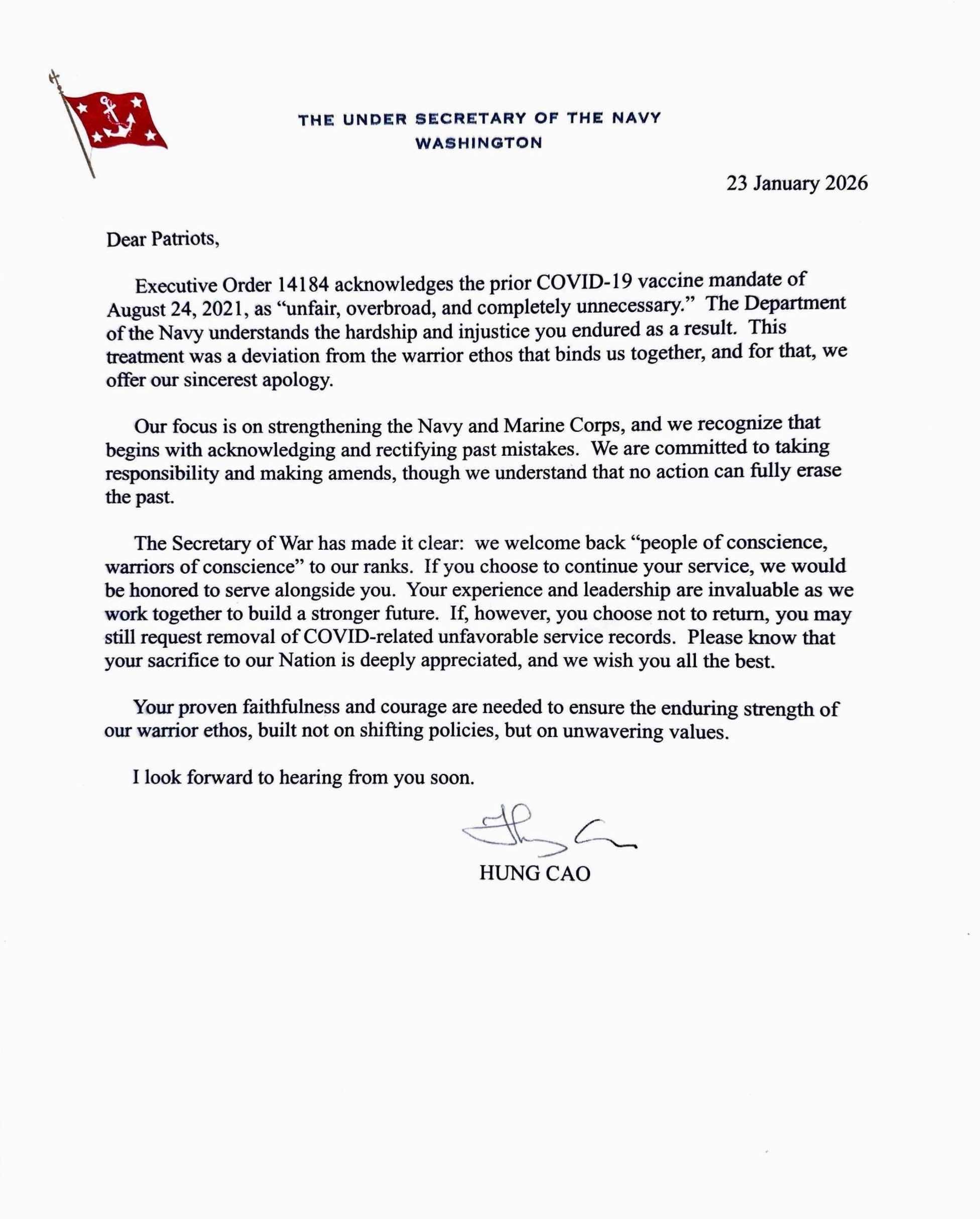 In addition to individual applications, the Department of the Navy is conducting proactive reviews of eligible Marine veterans who were involuntarily separated solely for refusal to receive the COVID-19 vaccine and received less than a fully Honorable characterization of service. Eligible individuals may receive a discharge upgrade without applying. This proactive effort is directed by the Department of War and the Department of the Navy to restore honor and correct injustices resulting from the COVID-19 vaccination mandate. Marine veterans who already have a pending application before a correction board will not be disadvantaged; those cases will be expedited for review.